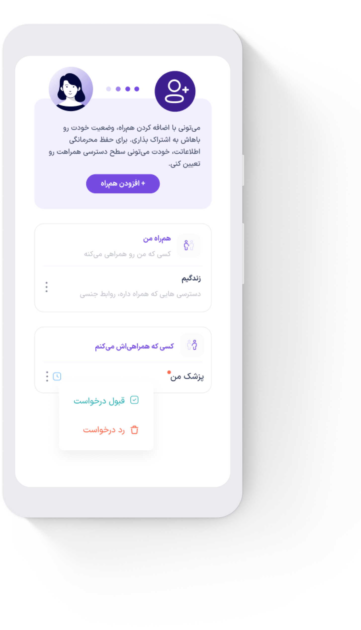با لونا میتونی همراه شخصی خودت رو به اپ اضافه کنی و با تعیین کردن سطح دسترسیش به تقویم پریودت، رابطه بهتری رو با هم تجربه کنین.
